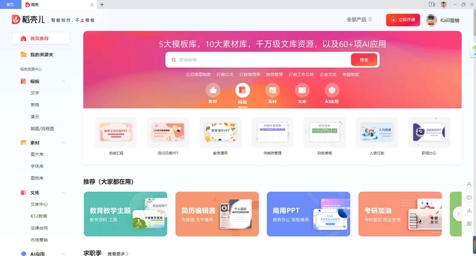 4、点击“新建演示”选项,显示的则是PPT板块,左侧栏目依旧是一些ppt的品类专区,点击“新建空白文档”新建一个空白的PPT,也可以点击其他模板进行使用。