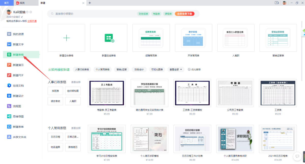 3、点击“新建表格”选项,显示的则是以往版本的Excel表格,左侧栏是一些品类专区,点击“新建空白文档”可以新建一个空白的表格,也可以点击其他模板文档进行使用。