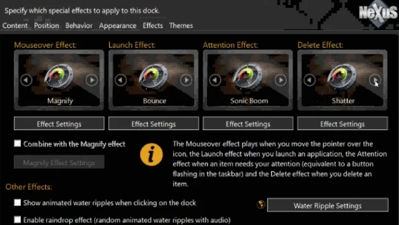 如果在ubuntu下面使用过awn dock这款软件,那么你一定知道。这类工具中,鼠标经过图标时的特效是非常重要的,windows下面的许多同类软件只提供了放大效果。而Winstep Nexus Dock就内置了17种效果,你可以在参数设置中选择,分别有:放大、平面放大、缩放、反弹、闪烁、晃动、摇摆、风、水滴等。